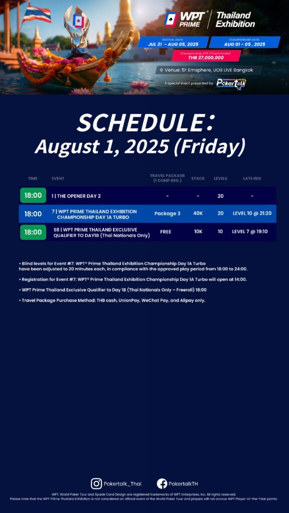 Two out of the three July 31, 2025 events were exclusive to Thai nationals. The Event S8: WPT Prime Thailand Exclusive Qualifier to Day 1A and Event S1: Satellite to WPT Prime Thailand Exhibition Championship. 10% of the field has progressed to the respective tournaments.