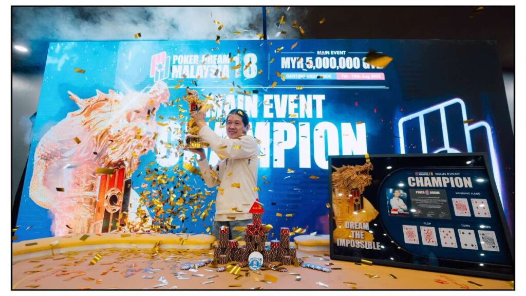 Liew Kok Kong made a deep run back at Poker Dream 13 in Kuala Lumpur (Nov 2024), finishing 45th for MYR 15,800 (~$3.5K). Less than a year later, he has transformed that near-miss into a career-defining triumph, embodying the spirit and glory of Poker Dream with confetti falling and a trophy in hand.