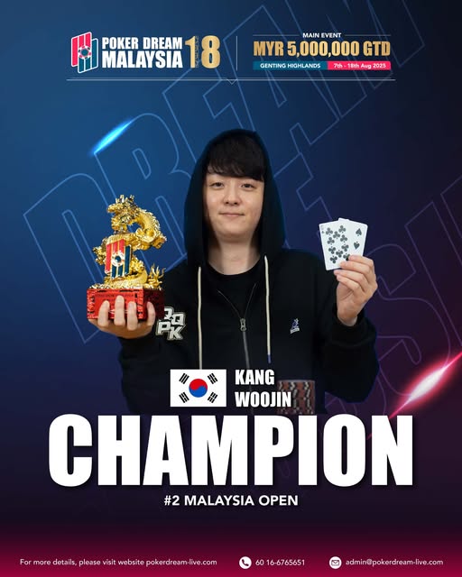 Kang Woojin is not a newcomer to Poker Dream; he finally captured his golden moment — winning the Malaysia Open (Event #2) from a massive 2,010-entry field to secure MYR 322,411 (~$76K), the biggest score of his career.