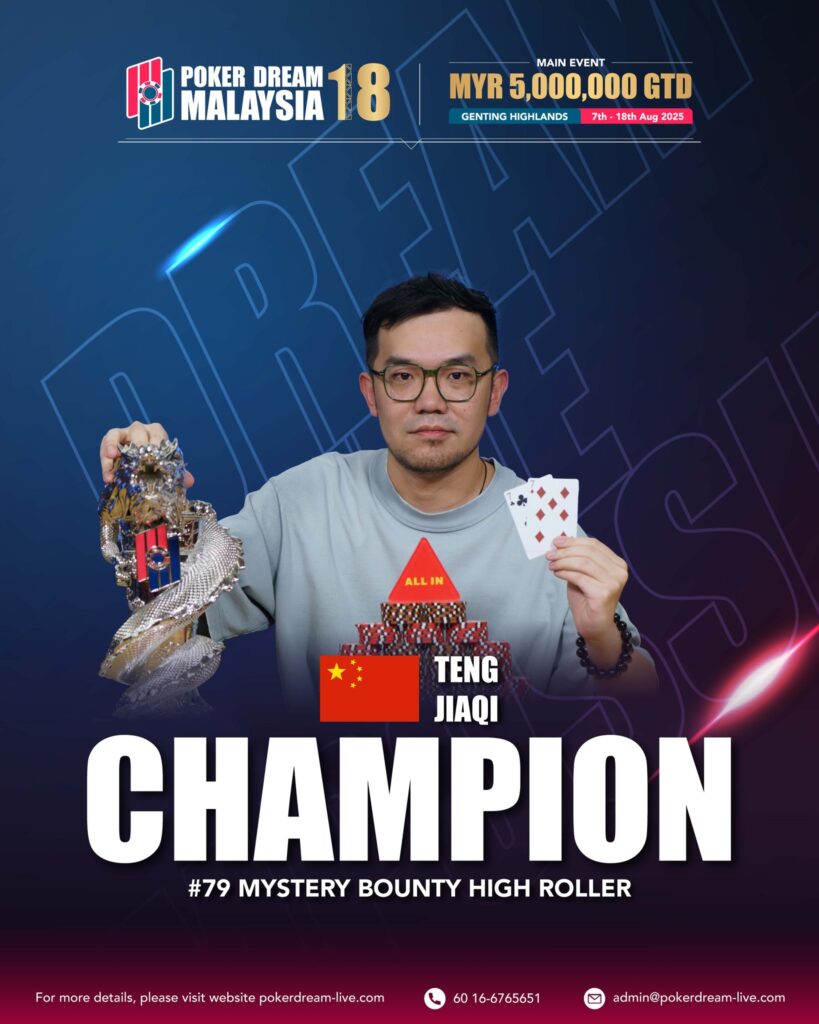 The adrenaline-charged MYR 1,000,000 GTD (~$227K) Mystery Bounty High Roller. The champion, China’s Teng Jiaqi has shown a clear flair for Mystery Bounty events at Poker Dream 18 Malaysia.